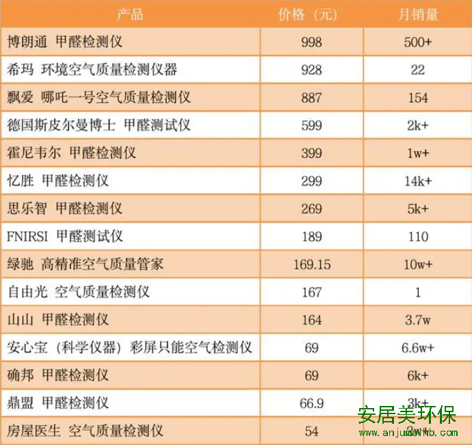 15款甲醛测试仪,价格区间从几十到近千元,月销量最高达10万+,涉及思乐智、忆胜、博朗通等品牌。