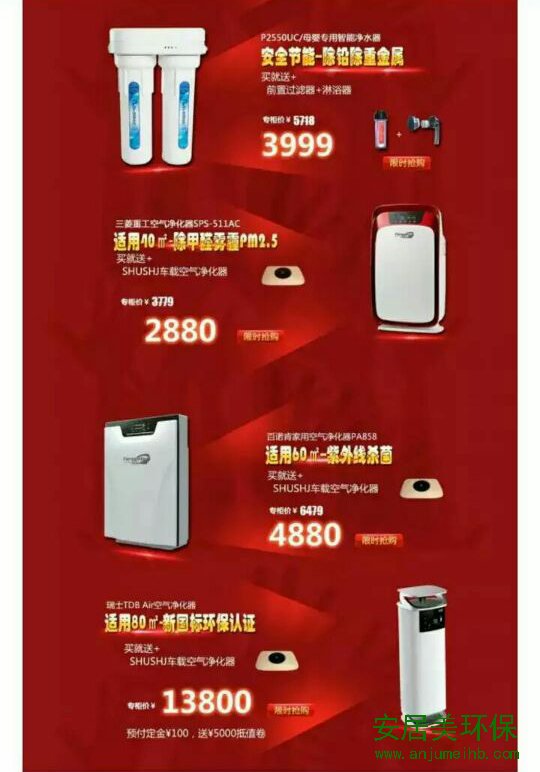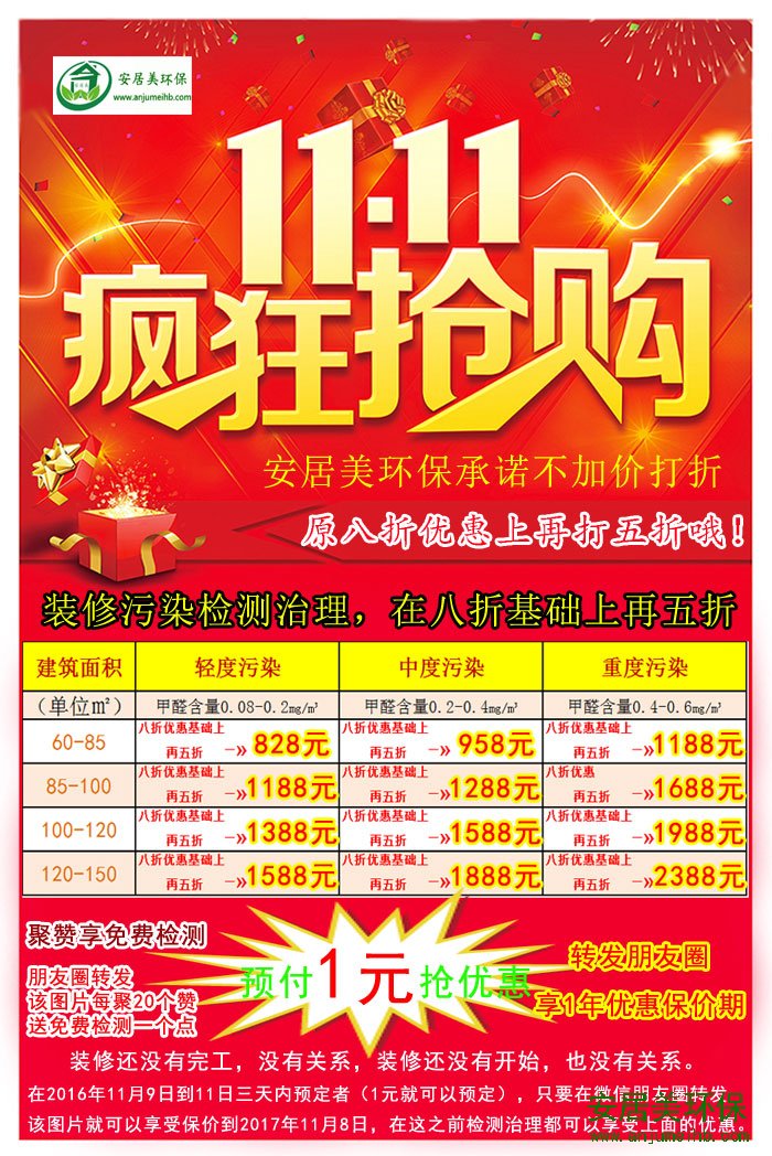 九江安居美环保有限公司(www.anjumeihb.com)是一家正规工商注册公司,证件资质齐全,产品具有无毒无二次污染检测报告,可开具正规发票,服务更有保障!安居美环保专注于室内空气检测、室内空气治理和室内空气净化业务为核心的高科技企业。公司从美国引进先进的物理激发技术,引进日本和德国的最新光触媒技术,并且在该基础上自主创新,研发了一套适合我国国情的特效甲醛激发酶,配合甲醛溶解酶、光触媒和除味剂等材料,独创了一套综合施工工艺,做到物理激发+光催化的独有施工工艺,确保一次治理、终身无忧!联系电话:15007920448。 双十一大优惠来啦!安居美环保甲醛检测和治理都在原八折优惠基础上再打五折: ![]()