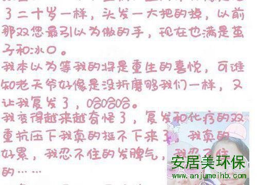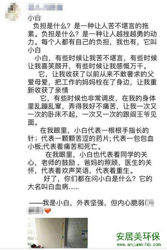 11岁女孩白血病二次复发写下遗书:妈妈 好好活着,九江装修污染检测公司首选安居美环保 为照顾患白血病的女儿,她放弃一切:“我给她说过,妈妈肯定不会让她孤孤单单地走。” 病情二次复发,11岁女孩写下“遗书”:“妈妈,请你带着我那份,好好地活着。”