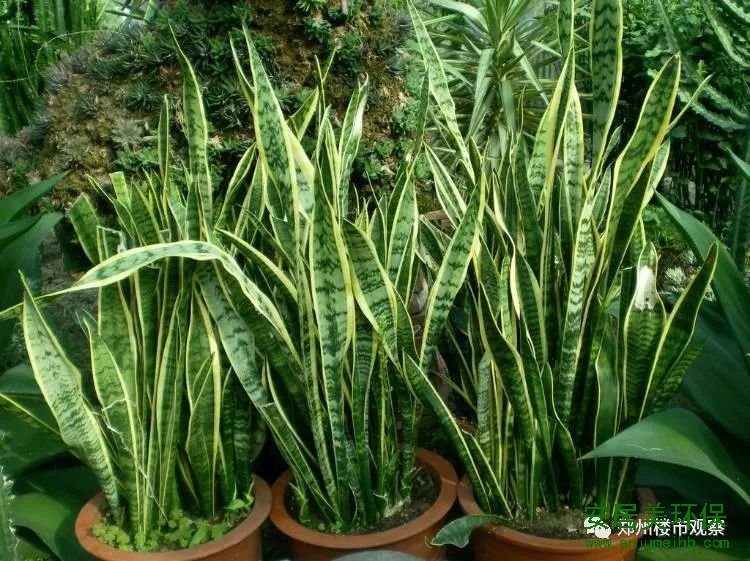 虎尾兰叶簇生,剑叶刚直立,叶全缘,表面乳白、淡黄、深绿相间,呈横带斑纹。常见的家庭盆栽品种,耐干旱,喜阳光温暖,也耐阴,忌水涝。可吸收室内80%以上的有害气体,吸收甲醛的能力一般般。