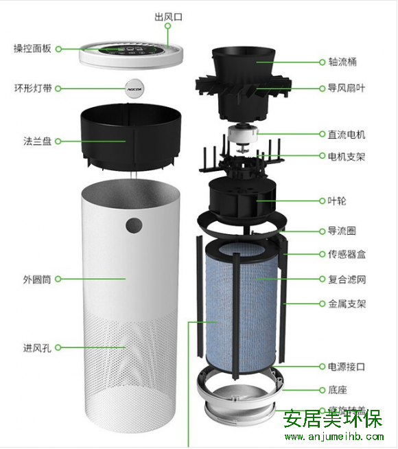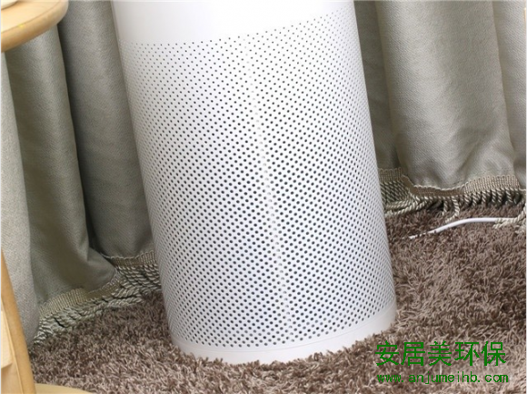 机身2/3被无数进风口占据 这款产品采用四周进风、顶部出风的方式,也就意味着洁净空气将从顶部出风口排出,而高速喷出的空气在倾斜角的作用下会形成涡流,让洁净空气在扩散的同时能够升得更高,实现洁净空气量的最大化和更高效的全屋净化。 2.净由“芯”生:多重滤网保证效果 我们购买空气净化器,最核心的作用当然还是净化效果,而这取决于其滤网和风机。目前大部分空气净化器采用复合滤网,艾吉森T01F也不例外,三合一复合滤网能够对空气中各种污染物进行吸附和过滤。艾吉森T01F的滤网在T01的基础上增加了对甲醛的吸附和过滤技术,六重净化,苛求洁净。