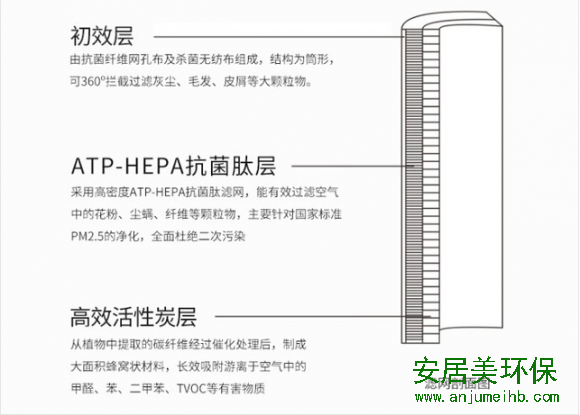 滤芯是决定净化效果的关键 复合滤网可分为初效层、ATP-HEPA抗菌肽层和高效活性炭层共三重结构,其中初效层由抗菌纤维网孔布和杀菌无纺布组成,桶状结构让其拥有360°净化的能力,有效拦截空气中的毛发、皮屑等大颗粒物,净化的同时延长内部滤网使用寿命。