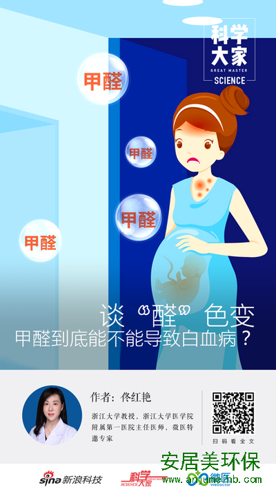 科学大家|谈“醛”色变:甲醛到底能不能导致白血病? ![]() 出品 | 新浪科技《科学大家》 撰文 | 佟红艳 浙江大学教授 浙江大学医学院附属第一医院主任医师 微医特邀专家 近期一则“阿里员工租住自如新装修好的出租房得了急性白血病离世”的新闻,刷遍了朋友圈,又一次将甲醛这个有机化学气体中的“一线明星”推到风口浪尖,也再次掀起了人们对甲醛和白血病的恐慌。那么,甲醛到底是否是导致白血病的罪魁祸首呢?九江安居美环保有限公司(www.anjumeihb.com)是一家围绕室内空气检测、室内空气治理和室内空气净化业务为核心的高科技企业。 甲醛是一种无色无味、氧化力强的刺激性气体,相对密度为1.06kg/m3,沸点为-21℃,极易挥发,溶点为-91℃,易溶于水和乙醇,是分子量最小的醛类物质,其30%~40%的水溶液称为“福尔马林”,就是手术标本固定防腐的溶剂。甲醛为较高毒性的物质,在我国有毒化学品优先控制名单上甲醛高居第二位。甲醛已经被世界卫生组织确定为I类致癌和致畸形物质,是公认的变态反应源,也是潜在的强致突变物之一。 ![]() 甲醛含量超标会带来哪些危害? 有关资料表明,室内空气污染比室外高5~10倍,污染物多达500多种。室内空气污染已成为多种疾病的诱因,而甲醛则是造成室内空气污染的一个主要方面。在国家颁布的《室内空气质量标准》中,甲醛含量应小于0.1mg/m³,大于这个数值,就属于甲醛超标。孕妇或者儿童的生活环境,一般应低于0.05mg/m³。值得注意的是,甲醛有致癌作用,其与癌症之间的因果关系一直引起人们的广泛关注。国际癌症研究中心的工作小组评估了甲醛致癌效应的相关研究报告后,将甲醛确定为I类致癌物,并将其列为与鼻咽癌相关的已知人类致癌物。 ![]() 甲醛是否会导致白血病? 既然甲醛有致癌作用,那么它究竟是不是导致装修白血病高发的罪魁祸首呢?大家都知道,急性白血病是是国内十大高发恶性肿瘤之一。在恶性肿瘤死亡率中,急性白血病居第6位(男性)和第8位(女性),在儿童及35岁以下成人中则居第l位。 科学家研究表明,白血病的发生与下面四个方面有着密切的关系:①病毒因素导致,如RNA肿瘤病毒感染而引起白血病;②化学因素如接触苯及其衍生物的人群白血病发生率高于一般人群。某些抗肿瘤的药物,如氮芥、环磷酰胺、甲基苄肼、VP16、VM26等都有致白血病作用;③放射因素如各种电离辐射,中等或大剂量辐射后都可诱发白血病;④遗传因素,具有染色体畸变的人群如唐氏综合症,白血病的发病率高于正常人。以上因素可导致患者体内发生染色体及基因变异,当携带这种变异的细胞逃过人体免疫监视,不断增殖,就会形成白血病细胞,导致白血病发生。 但是,甲醛是否会导致白血病,至今没有定论。如吸入多少甲醛会得白血病也没有一个明确的说法。但确实有很大一部分白血病患者发病前都有房屋装修或居住新装修房屋的经历。 2004年美国职业安全和健康研究所调查了11039名曾在甲醛超标的环境中工作3个月以上的工人,发现有15名死于白血病。美国国立癌症研究所调查了25019名工人,发现有69名死于白血病,相对危险度随着甲醛浓度的增高而增加,所以推测甲醛可能与白血病发生有关。 目前还缺乏对甲醛与儿童白血病关系的研究。北京市儿童医院调查发现,近90%的白血病患儿家中短期都曾经装修过。由于儿童成长过程中造血器官尚未发育成熟,造血功能尚不稳定,甲醛超标对儿童的影响可能比成年人更为严重。 ![]() 甲醛对人体健康的影响不容小觑 虽然甲醛和白血病的发生目前尚未科学方面的数据支撑,但甲醛对皮肤黏膜有刺激作用。甲醛是原浆毒物质,能与蛋白质结合、引起皮肤干燥、皮炎、流泪、眼红、眼痒、打喷嚏、咳嗽等症状,严重者出现眼结膜炎、鼻咽部疾病等,甚至发生喉痉挛、肺水肿。 致敏作用和免疫毒性:甲醛作为一种环境致敏原,可以引起皮肤色斑,过敏性皮炎、甚至坏死,吸入高浓度甲醛时可诱发支气管哮喘。同时甲醛还具有一定的免疫毒性,抑制机体的免疫功能。 神经毒性:甲醛具有神经毒性,引起头痛、头晕、疲劳、记忆困难、情绪波动等神经症状。 致畸作用:甲醛是遗传毒性物质,孕妇长期吸入可能导致胎儿畸形,甚至死胎;男子长期吸入可导致男子精子畸形、精子活力下降等。 ![]() 发生了以下情形,说明你吸入了甲醛 通过症状可以初步估计环境中的甲醛含量。甲醛浓度达到0.08-0.09mg/m3时,儿童就会发生轻微气喘。当达到0.1mg/m3时, 就有异味和不适感;达到0.5mg/m3时,可刺激眼睛,引起流泪;达到0.6mg/m3时,可引起咽喉不适或疼痛。浓度更高时,可引起恶心呕吐,咳嗽胸闷,气喘甚至肺水肿;达到30mg/m3时,会立即致人死亡。 短时间吸入甲醛如果没有过敏和刺激症状,过段时间甲醛就会代谢掉,不会引起严重后果。发现接触甲醛后,关键是要离开甲醛浓度超标的场所,大量的吸入新鲜的空气,并及时观察是否出现有肺水肿等严重情况。近期可以多喝水,水分能够促进甲醛排出体外;也可以喝一些牛奶起到中和作用。家里面要找到甲醛释放的源头进行处理。 如果吸入甲醛出现皮肤黏膜的刺激作用,如皮炎、流泪、眼红、眼痒、打喷嚏、咳嗽、头晕等症状,需及时去医院进行治疗。 这些地方会有甲醛,你要小心 室内空气中的甲醛 室内空气中甲醛已经成为影响人类身体健康的主要污染物,来源主要有以下几个方