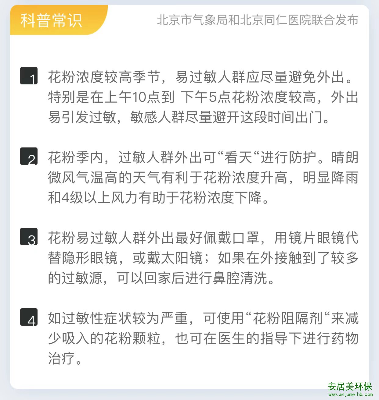 【九江测甲醛】口罩面罩齐上阵,过敏星人的痛你不懂!教你一招 九江安居美环保有限公司(www.anjumeihb.com)是一家专业的九江甲醛检测公司,九江甲醛检测公司电话:15007920448,一次治理终身质保,无效果退全款,九江除甲醛公司。 北京刚刚过去的周末天朗气清,可是,有的人还没来得及好好赏百花,享春光,就迎来了最难熬的时期——花粉季。朋友圈里陆陆续续出现口罩面罩齐上阵的“过敏星人”,要想顺利度过花粉季可真难。