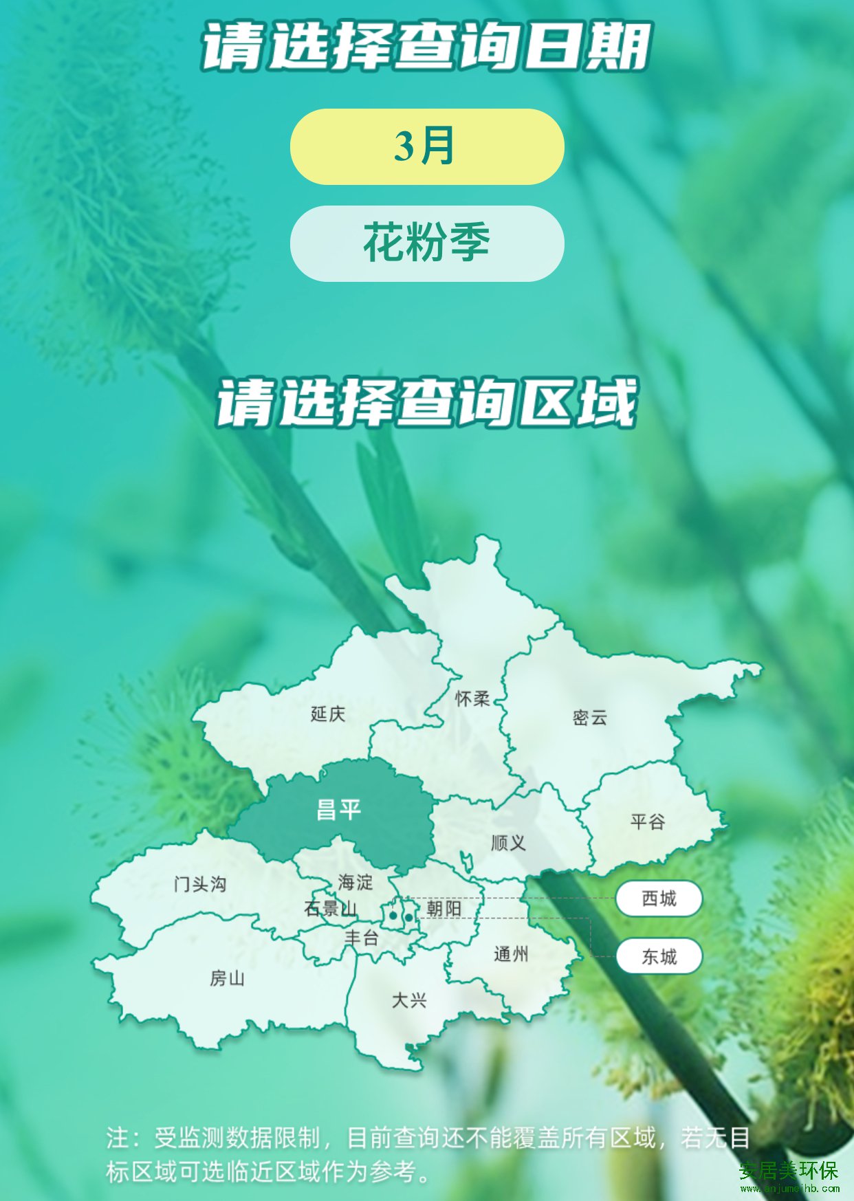 在由北京市气象局所发布的小程序“花粉健康宝”中,市民既能查询北京花粉情况的总数据,还能查询各区主要种类的花粉总浓度数据。