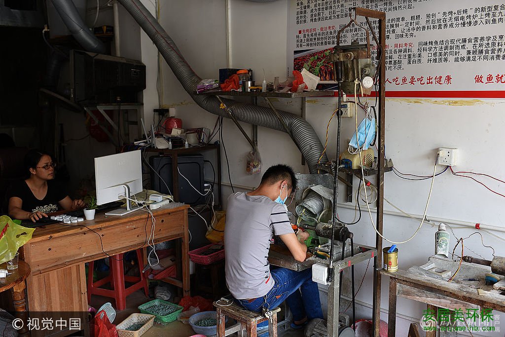 在四会市,这样的家庭玉器作坊仍不少,当年胡汉清夫妻俩的作坊就和这差不多。胡汉清说:“越勤劳的人死得越快,因为吸入的粉尘也越多,我们夫妻俩就是拼命干,如今是这个下场。当年整个村子有数千家作坊,到处飘散着粉尘,走到哪都能听到机器的轰鸣声。”