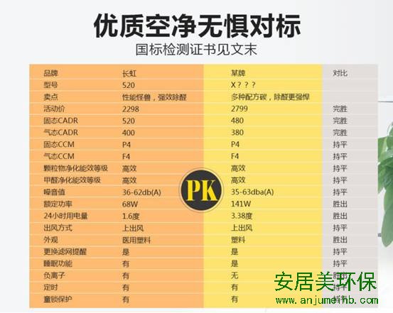 现在,这台空气净化器就装在家里,几乎每天都是打开的。希望持续的净化,能够有效的降低室内甲醛。因为小孩子在这个年龄阶段,容易遭受恶劣的空气污染影响。对孩子的生长发育影响非常大。九江安居美环保有限公司(www.anjumeihb.com)是一家围绕室内空气检测、室内空气治理和室内空气净化业务为核心的高科技企业。 附: 长虹空气净化器KJ520F-B1M性能参数对比 这款长虹空气净化器,CADR值520m3/h,甲醛CADR值标称的是400m³/h, 20-50平方的房间,PM2.5和甲醛都可以快速净化好。 具体参照下图(数据来源于长虹净化器旗舰店)