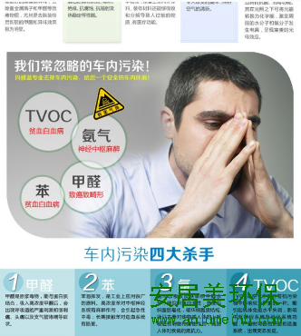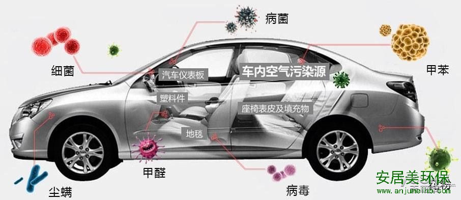 自2012年3月1号《乘用车内空气质量评价指南》出台以来,新车空气质量、如何去除异味等越来越受到人们的重视。新车异味是因为气体中包含了很多带有刺激性的有害物质,不仅影响驾驶人开车时的心情和注意力,而且长期待在有异味的车内还会影响身体健康。九江安居美环保有限公司(www.anjumeihb.com)是一家围绕室内空气检测、室内空气治理和室内空气净化业务为核心的高科技企业。 新车污染的严重性已经众所周知,市场上的常规处理产品也很多,但是存在的问题是污染去除不彻底,很短时间材料释放的污染又充满驾乘空间,反复侵害我们的身体健康。造成这一问题的原因是市场上的产品仅能去除材料已经释放出来的污染,或者材料表层的污染,而对于材料深层次缓慢释放出来的污染没有消除,也就是常说的没有去根,这样治理是没有意义的,甚至是让人们放松是警惕,造成了长期的更大的危害。