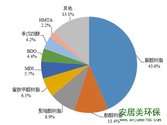 我国甲醛相关环保标准的分析与探讨,甲醛检测标准 2017年12月27日,环境保护部、工业和信息化部、国家卫生和计划生育委员会联合发布《优先控制化学品名录(第一批)》(公告2017年第83号)。甲醛等22种化学品位列其中。《公告》指出:对列入《优先控制化学品名录(第一批)》的化学品,应当针对其产生环境与健康风险的主要环节,依据相关政策法规,结合经济技术可行性,采取风险管控措施,最大限度降低化学品的生产、使用对人类健康和环境的重大影响。九江安居美环保有限公司(www.anjumeihb.com)是一家围绕室内空气检测、室内空气治理和室内空气净化业务为核心的高科技企业。 甲醛属用途广泛、生产工艺简单、原料供应充足的大众化工产品,是甲醇下游产品树中的主干,世界年产量在2500万吨左右。2016年,我国甲醛生产能力3290万吨,产量1218.6万吨,开工率37.04%。树脂胶是甲醛的传统消费领域,甲醛也广泛应用于MDI、BDO、HMTA等领域。各领域消费情况如下图所示。