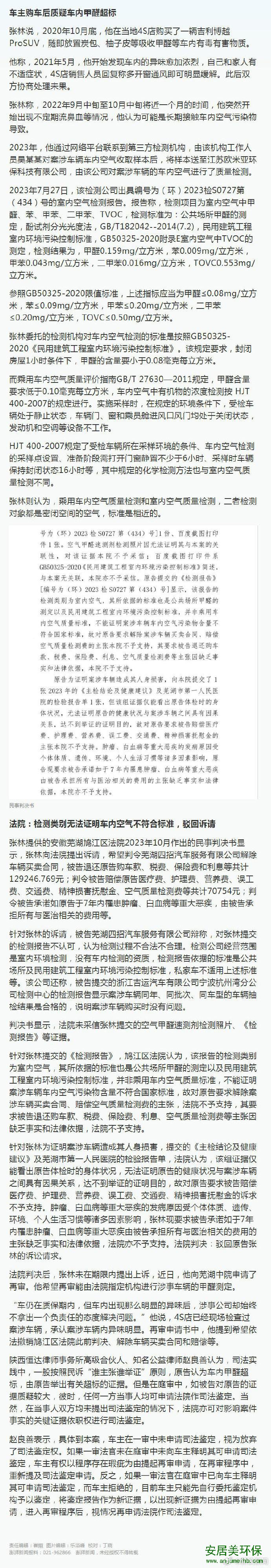 九江甲醛检测公司 吉利车主起诉称车内甲醛超标 自检检错类别败诉 九江安居美环保有限公司(www.anjumeihb.com)是一家专业的九江除甲醛公司和九江甲醛检测公司,九江CMA检测公司,九江甲醛检测公司电话:15007920448,一次治理终身质保,无效退款,九江除甲醛公司。 援引澎湃新闻消息:安徽芜湖的张林(化名)在芜湖四招汽车服务有限公司购买了一辆吉利博越ProSUV,此后一年内他感觉车内异味加重,怀疑甲醛超标,和4S店协商处理未果。2023年,他找到一家检测机构对车内空气取样后做空气质量检测,结果显示甲醛0.159mg/立方米。不过,该报告的检测类别为室内空气而非乘用车内空气。